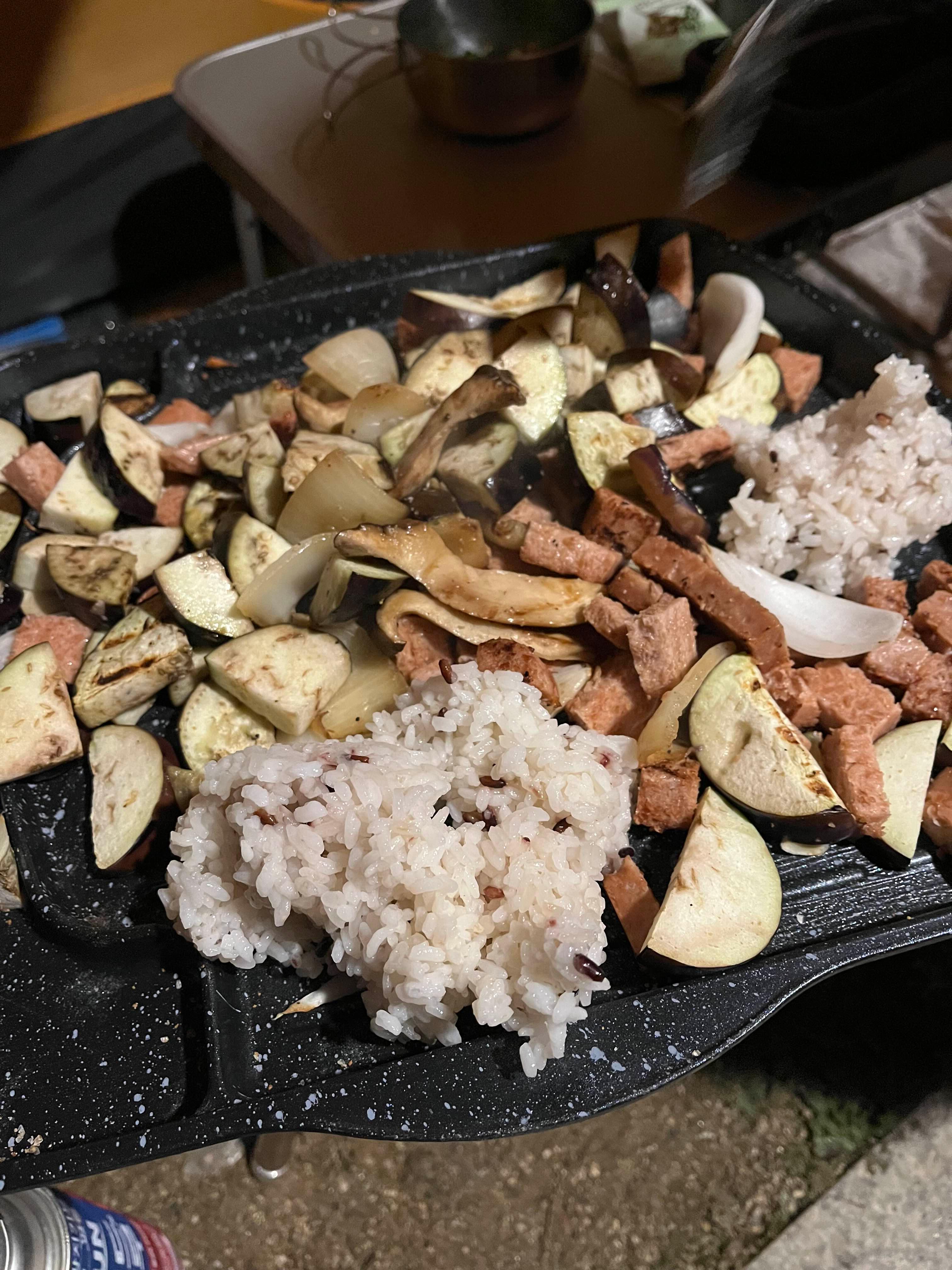 아침 뭐 먹었더라 ? 엄마가 식물성 햄이랑 어제 남은 야채랑 구워줌